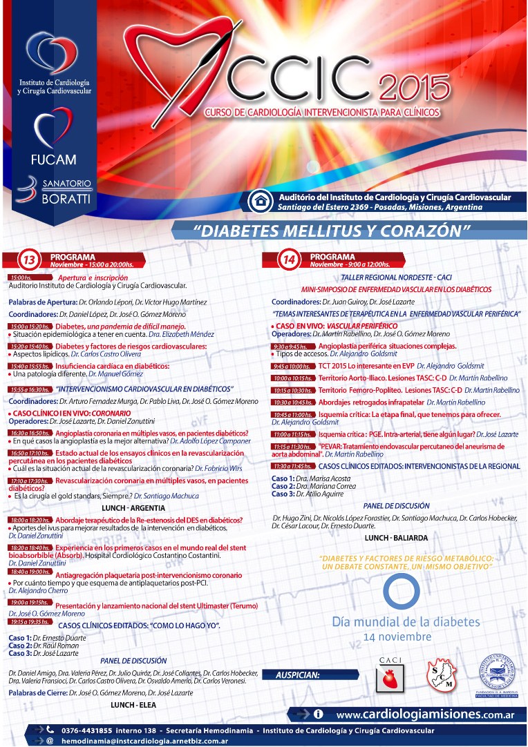 09/11/15.  Cronograma Viernes 13 de Noviembre10:00 hsApertura e inscripciónAuditorio Instituto de Cardiología y Cirugía Cardiovascular.Palabras de Apertura: Dr. Orlando Lépori, Dr. Víctor Hugo MartínezCoordinadores: Dr. Daniel López, Dr. José O. Gómez Moreno15:00 a 15:20 hsDiabetes, una pandemia de difícil
